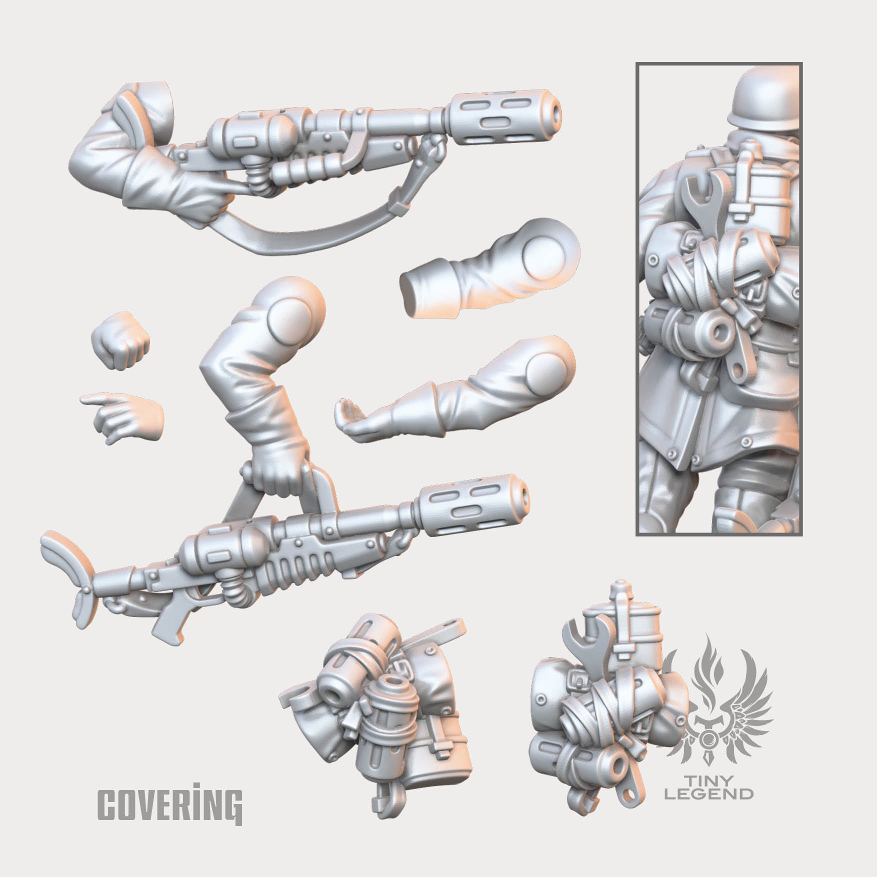 The kit contains 2 arms with fusion rifles for different poses, 2 backpacks, spare arms and hands. Works well with any of these bodies, veteran guardsmen and shock troops.