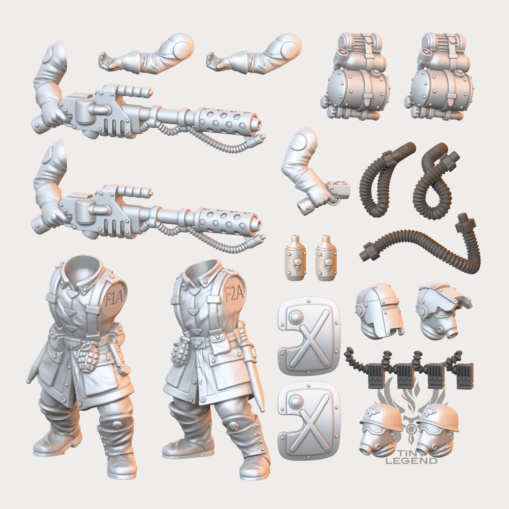 The kit contains 2 multipart infantry models with heavy flamers, 2 backpacks, 7 flexible hoses (3 for flamers, 4 for heads), 2 х 28.5 or 1 x 50 mm bases. Can be assembled as a team with one heavy flamer or as 2 separate infantry models with heavy flamers. Don't forget about spare heads and bases, if you need some.