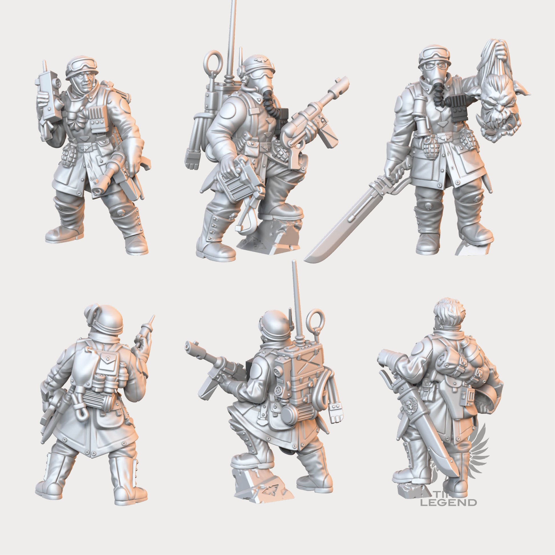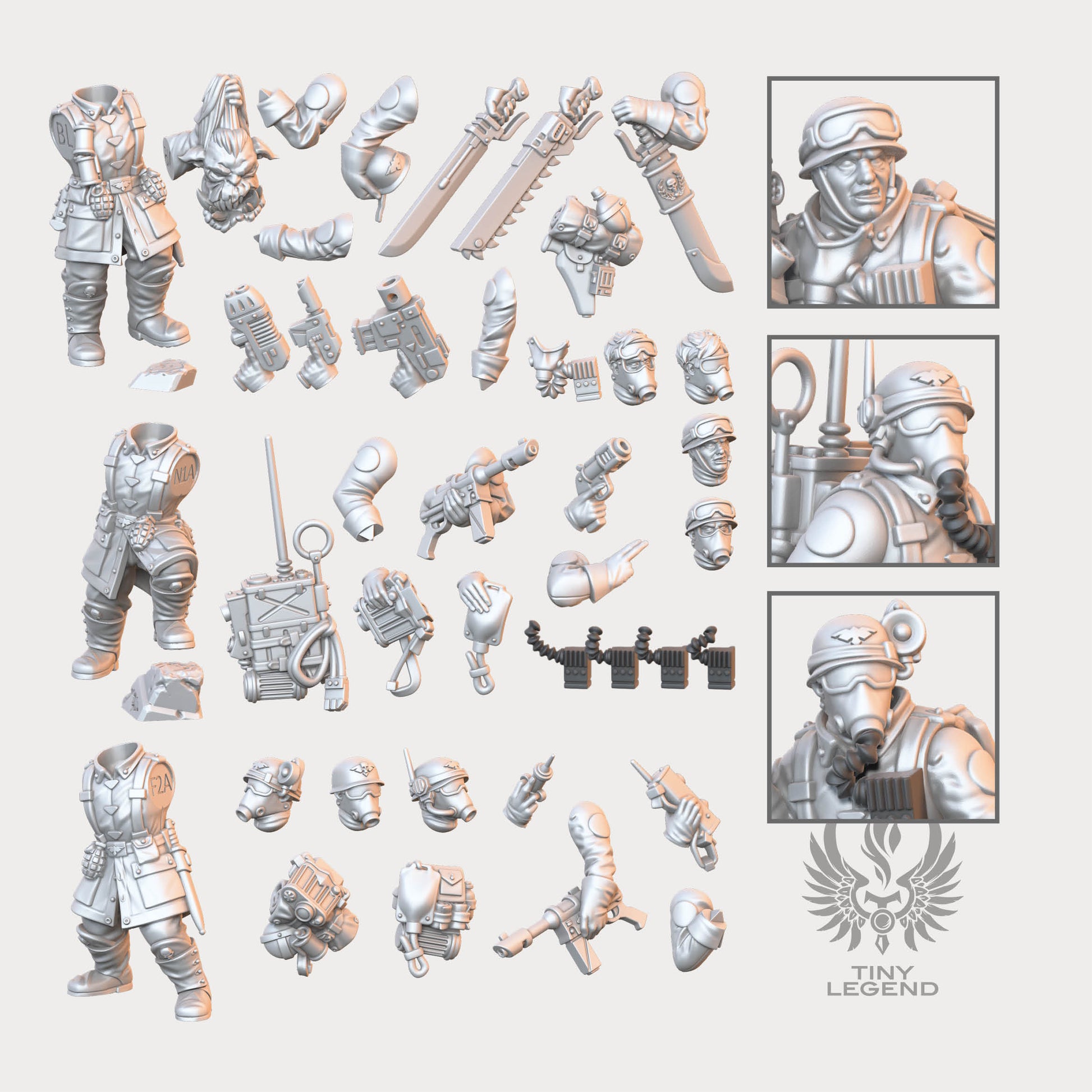 The kit contains 3 multipart infantry models (sergeant, spotter/medic, radio caster) with weapon and equipment options, spare arms and hands, flexible dust filters, 2 basing pieces, 3 x 25 mm bases.