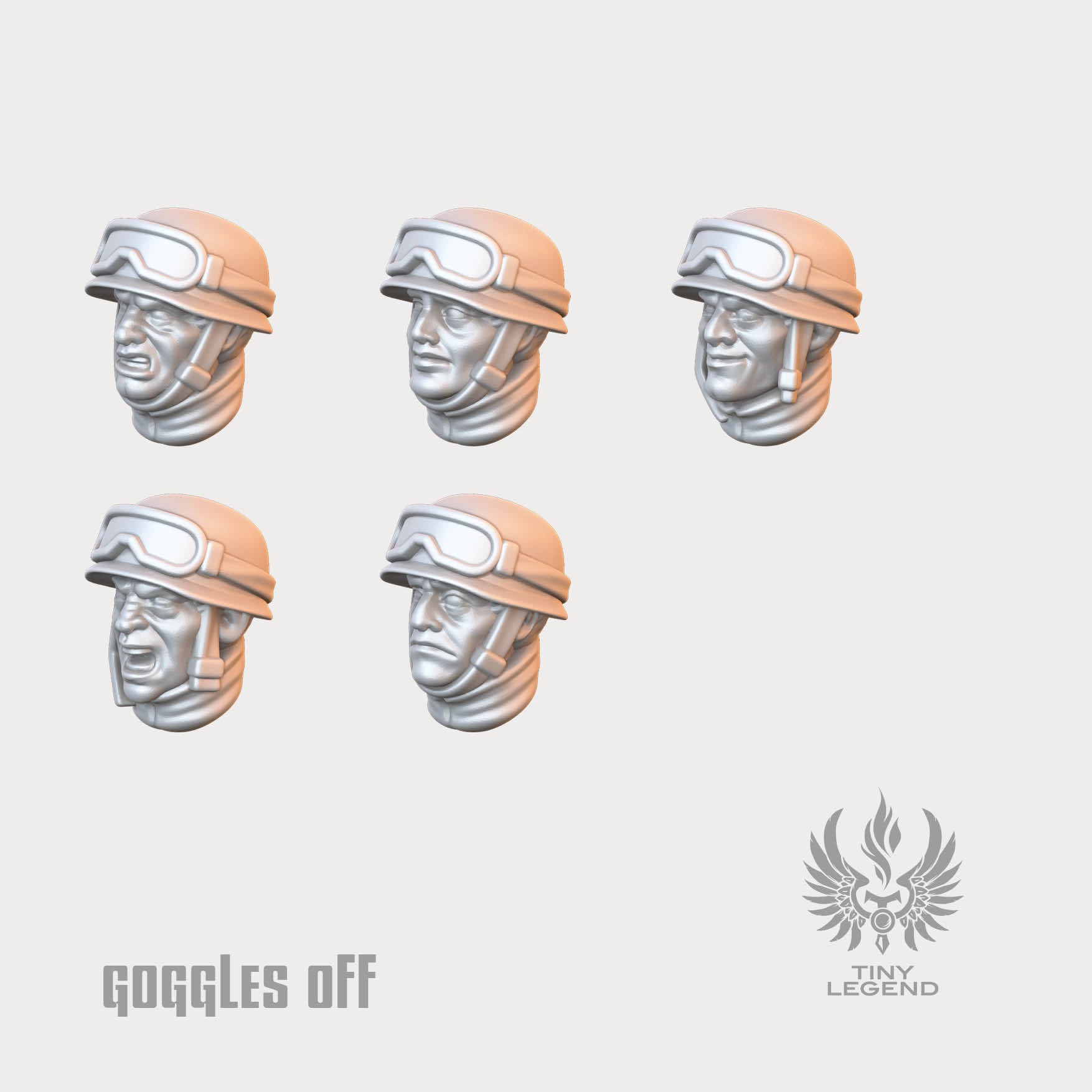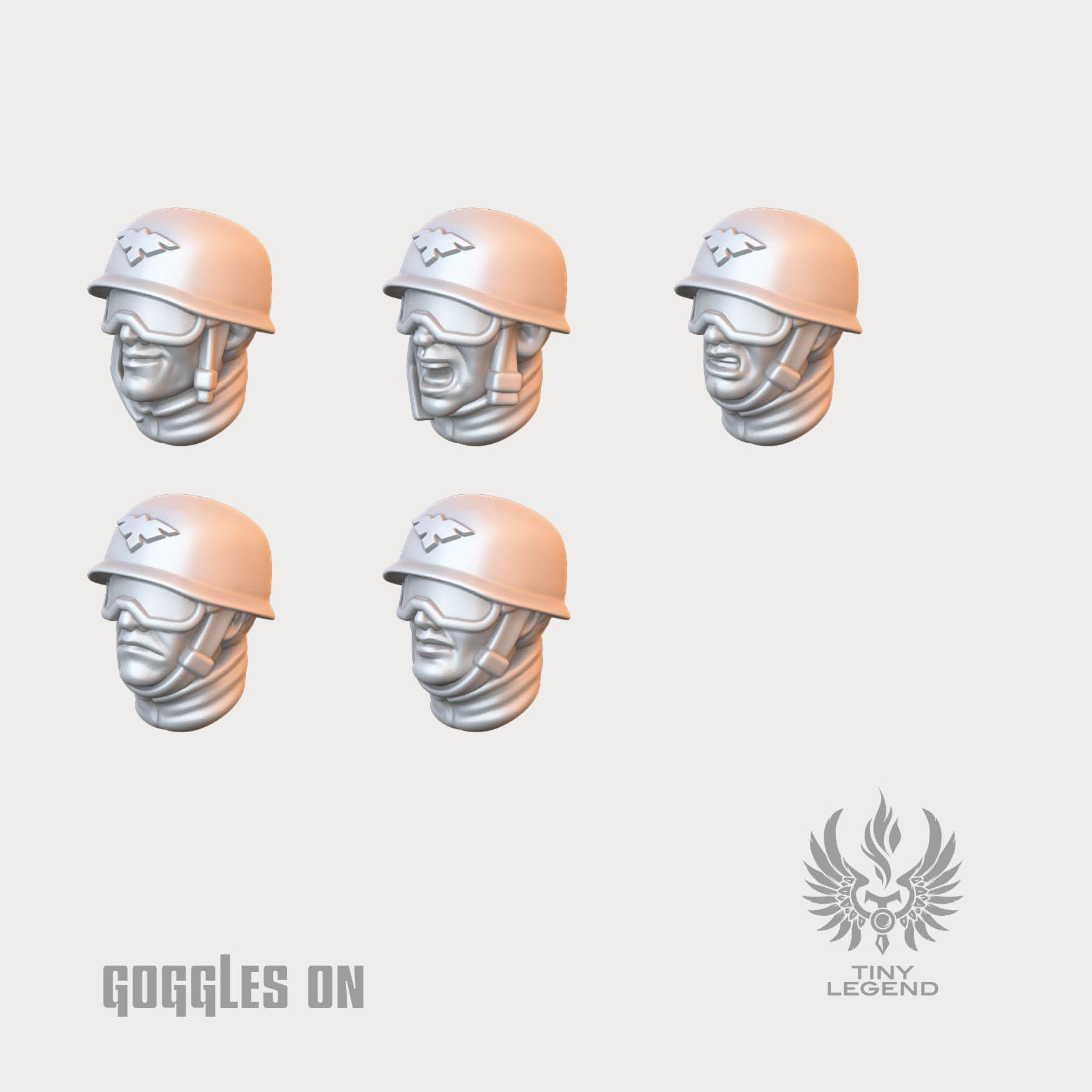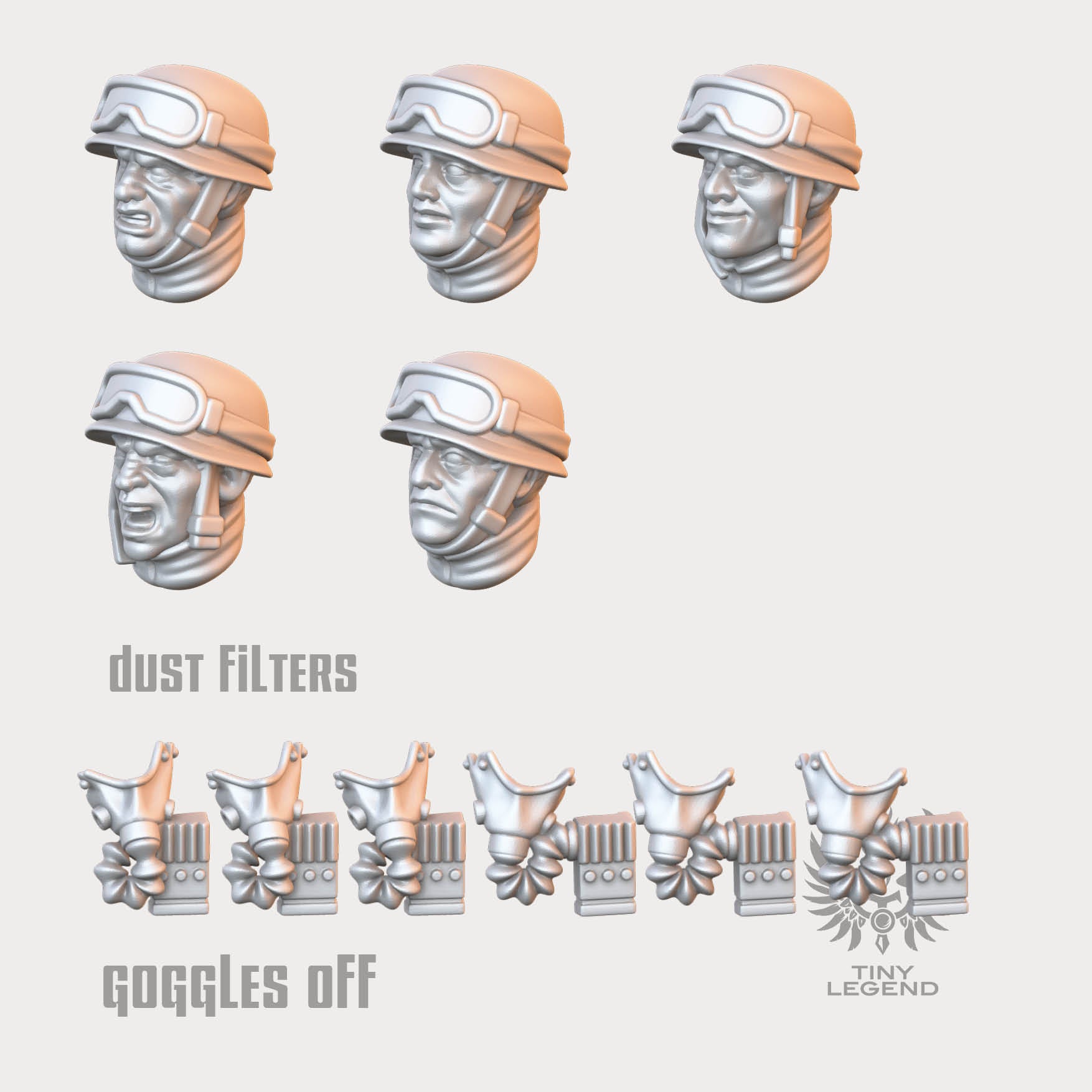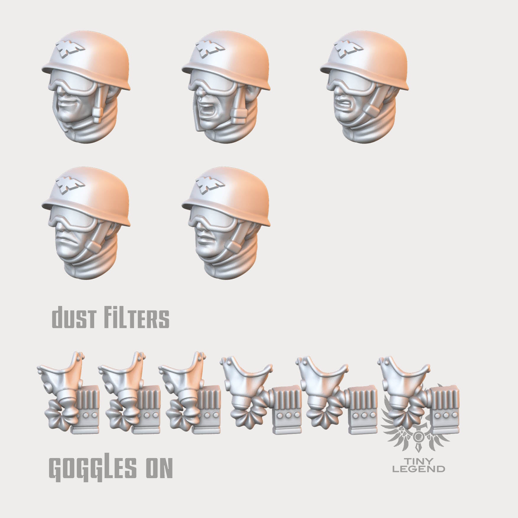 The kit contains 5 heads with universal ball neck lock and 6 dust filters. Fits well to any models with suitable neck lock: to any of these bodies, rough riders and shock troops.